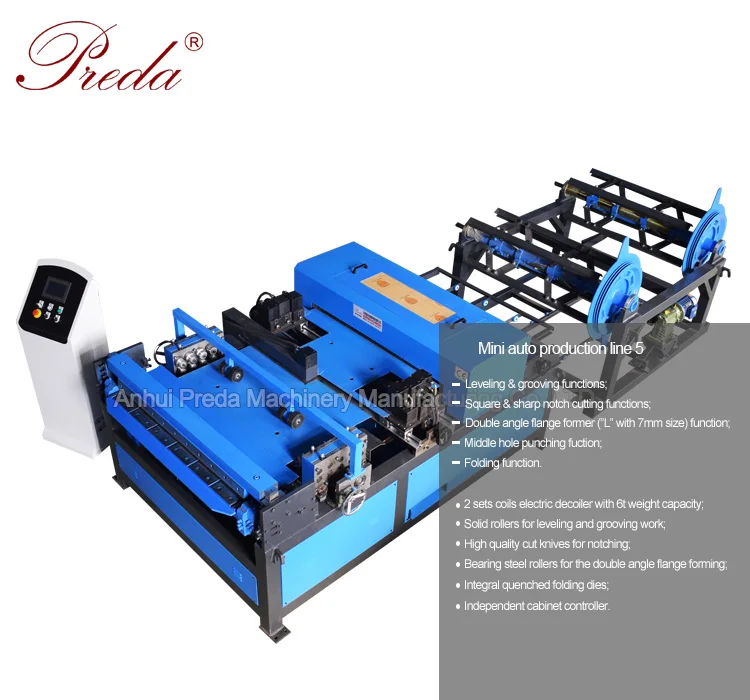 Small mini auto duct line 5 with angle steel flange former super air duct production line ![]() ![]() ![]() Product Description Mini auto duct line 5 from Preda MachinePreda mini auto duct line 5 is a device for the production of rectangular ducts with angle flange former, the ducts more suitable for TDC flange types, whose automated production process replaces traditional manual manufacturing. The mini auto duct line 5 compared with auto duct line 5, there is less TDF flange forming and locker forming, which is mainly used to form the "L" shape both sides. Its structure is leveling, beading, notching (capable of sharp notching, TDF notching), plate shearing and plate folding.